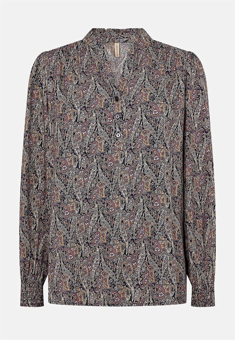 Blus från Soyaconcept. Modern blus sydd i ett skönt linne/viskosblandat tyg som är vävt. Avslappnad genomknäppt modell med volangavskärningar och långa ärmar med manschett och knapp. Längd från axeln ca 78 cm i storlek S (38).
