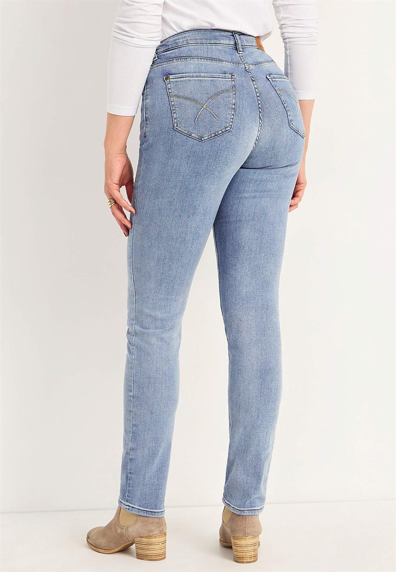 Perfekt modell om du vill behålla stilen utan att tumma på bekvämlighet och rörelsefrihet. • Klassiska jeans med fem fickor och god stretch. • Smal, rak modell med resår i sidorna som gör jeansen extra bekväma att bära. • Stretchjeans i 5-ficksmodell. • Dragkedjegylf. • Linning med hällor. • Bekväm resår i sidorna. • Dekorativa stickningar på bakfickorna. • Normalhög midja. • Figurnära passform. • Raka benslut. • Två innerbenslängder: Kort ca 76 cm. Lång ca 81 cm. • Grenhöjden följer storleken ca 23-33 cm.