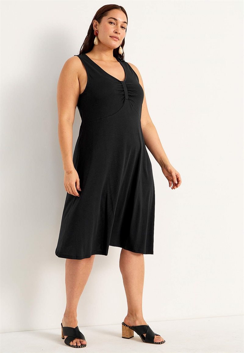 • Klänning med fin lyster och vågig strukturväv. • Något slätare struktur på enfärgad svart. • Lätt a-linjeformad modell. • Överlappad v-ringning. • Insnitt vid bysten. • Ok med snyggt veck bak. • 3/4-långa, vida ärmar med smal manschett i ärmsluten. • Rundad nederkant något längre baktill. • Längden följer storleken ca 96-108 cm från axeln. LENZING™ ECOVERO™-fibrer tillverkas med minst 50 % mindre koldioxidutsläpp och vattenförbrukning jämfört med generisk viskos. Fibrerna är gjorda av kontrollerade eller certifierade träkällor. Fibrerna ger naturlig mjukhet och drapering.