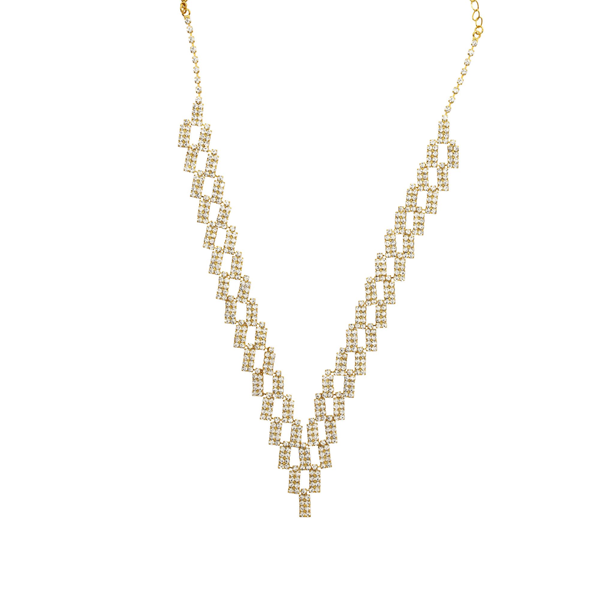 Set med halsband och örhängen. Guldfärgat med vita kristaller.