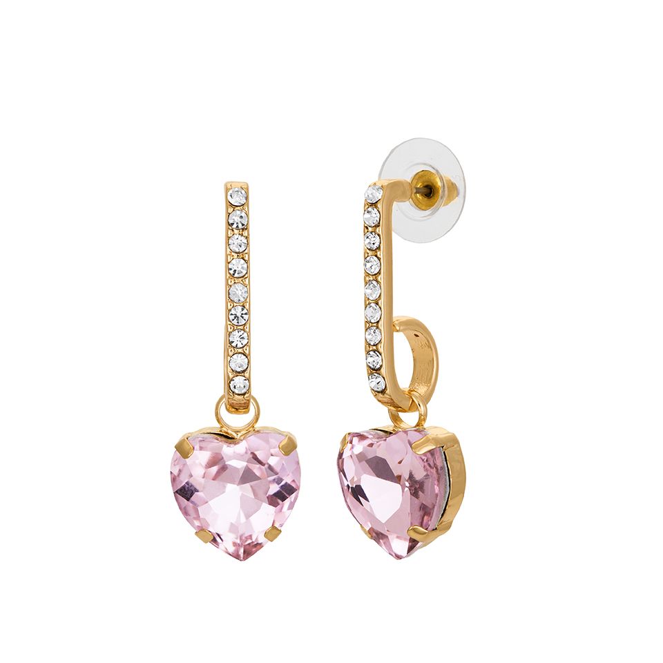 Guldfärgade studörhängen med kristaller och hängande hjärta med slät yta. Finns även i silverfärg.