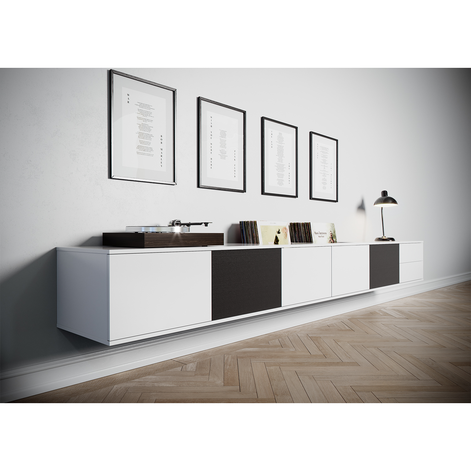 Komplett hifi-möbel med tygluckor för montering på väggen. Tre sektioner och 45 cm djup. Solid kvalitet i 16 mm MDF och finish i svart eller vit lack.
